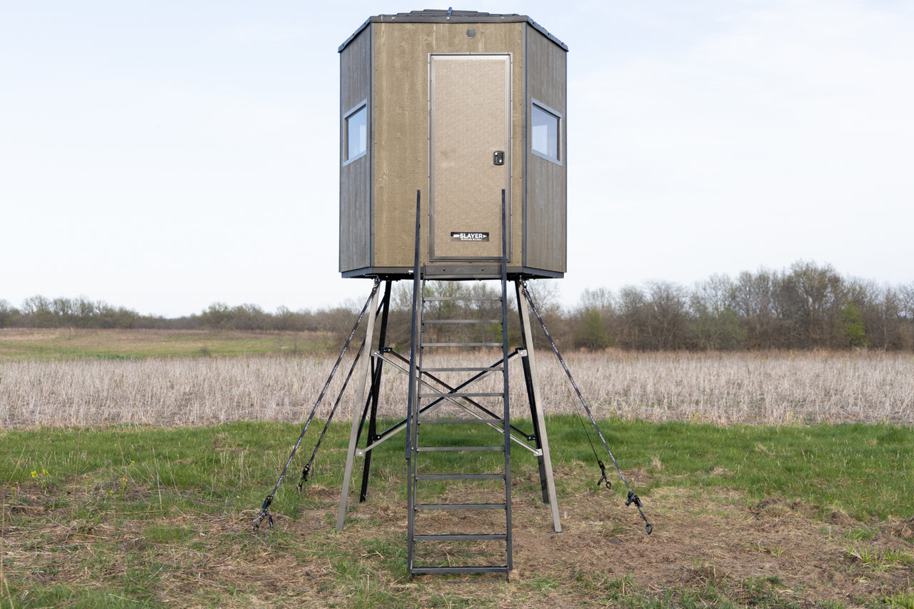 Built specifically for our Slayer Blinds, the 7-foot tower bolts directly to the aluminum base plates of the Slayer Blind. The 7′ tower is fabricated using heavy gauge 2″ square aluminum tubing and welded construction. The towers are built with cross bracing for strength and stability. We have developed a staircase that includes double sided handrails for safety and aggressive non-skid treads. The tower is easily assembled and disassembles quickly for easy transport.