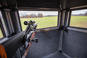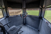 The Slayer Blind has a specious layout and is 6'6" from one side to the other. The 5 sided design gives you fantastic visibility where it matters most. The ceiling is 6'6" on the edges and 7'3" in the center. Our windows feature a silent open and close system allow you to stay comfortable in the worst of hunting conditions. The walls and floor are fully carpeted to deaden sound.